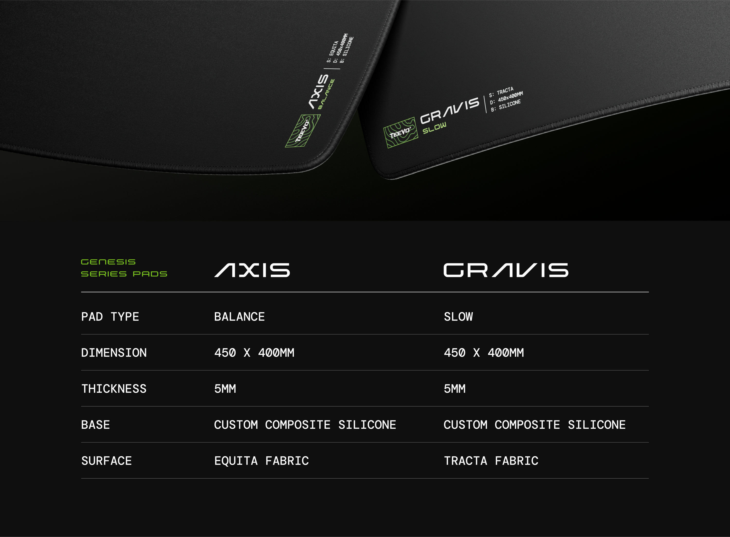 Genesis means creation. The Genesis Series marks the first step of our foundation. More than a product line, it is a statement of who we are and what we aim to create. Within the Genesis Series, Axis represents balance in motion the harmony between speed and accuracy, designed for players who demand both agility and control. Gravis, grounded in the spirit of gravity, anchors every movement with purpose, built for those who value precision and mastery above all.