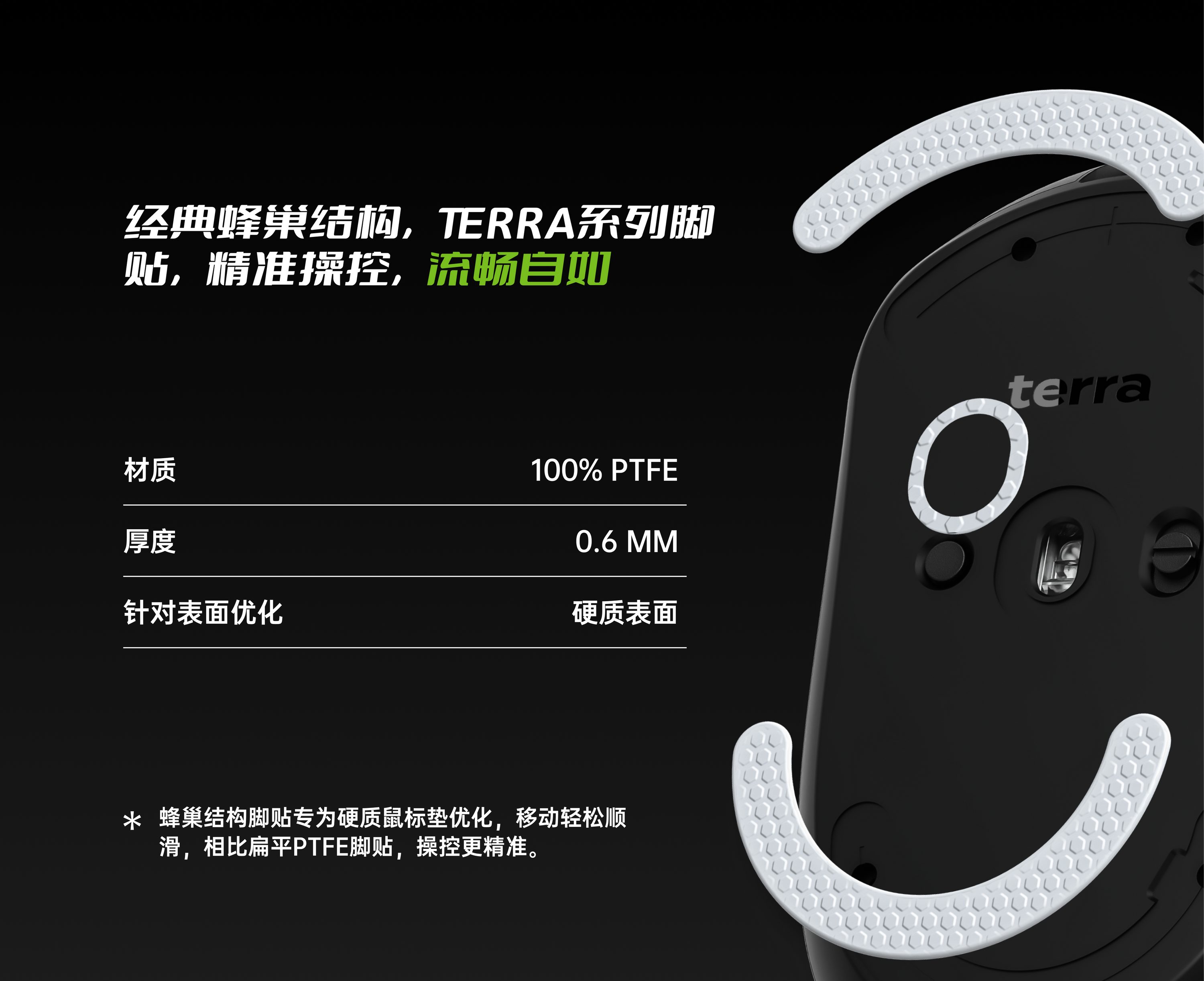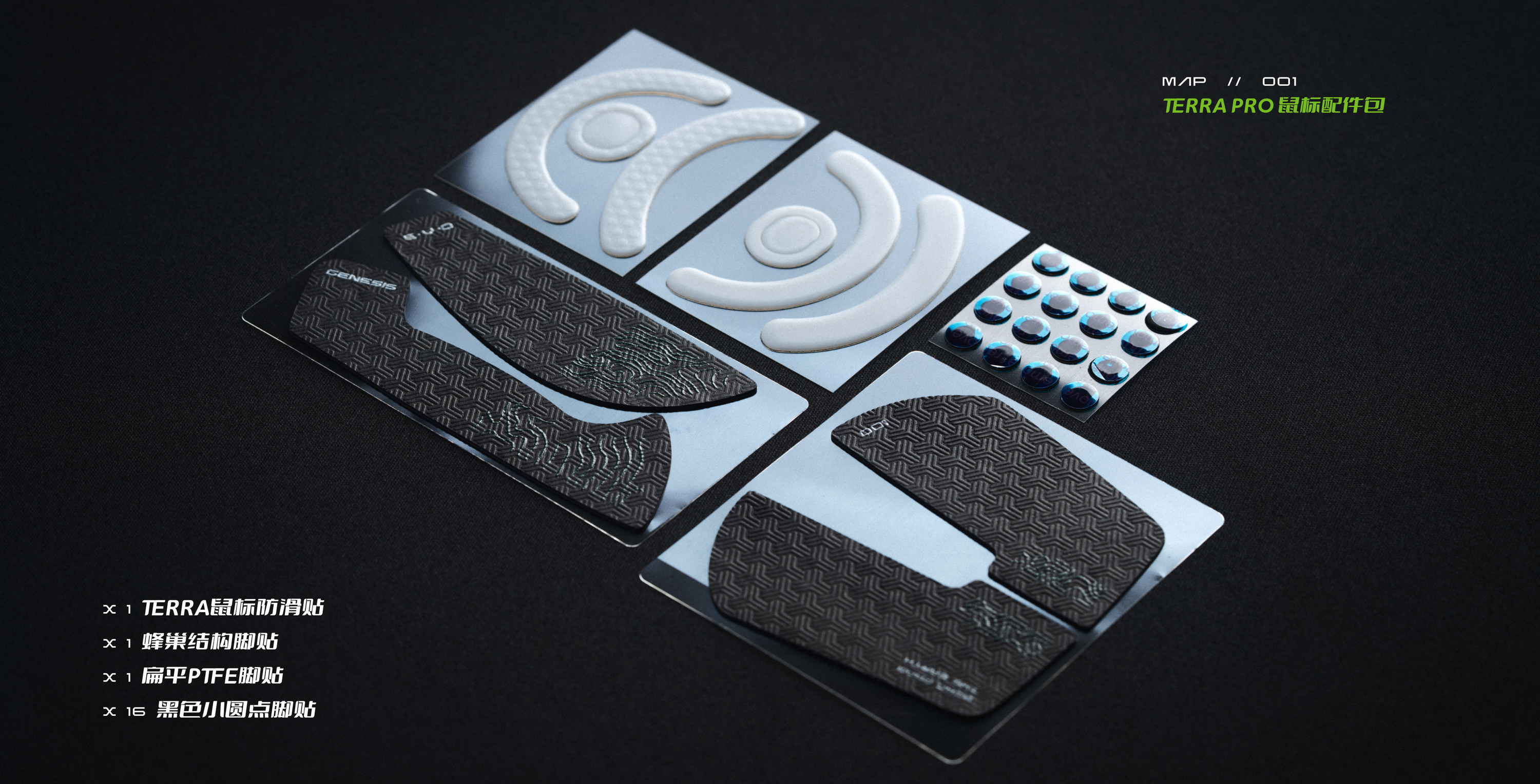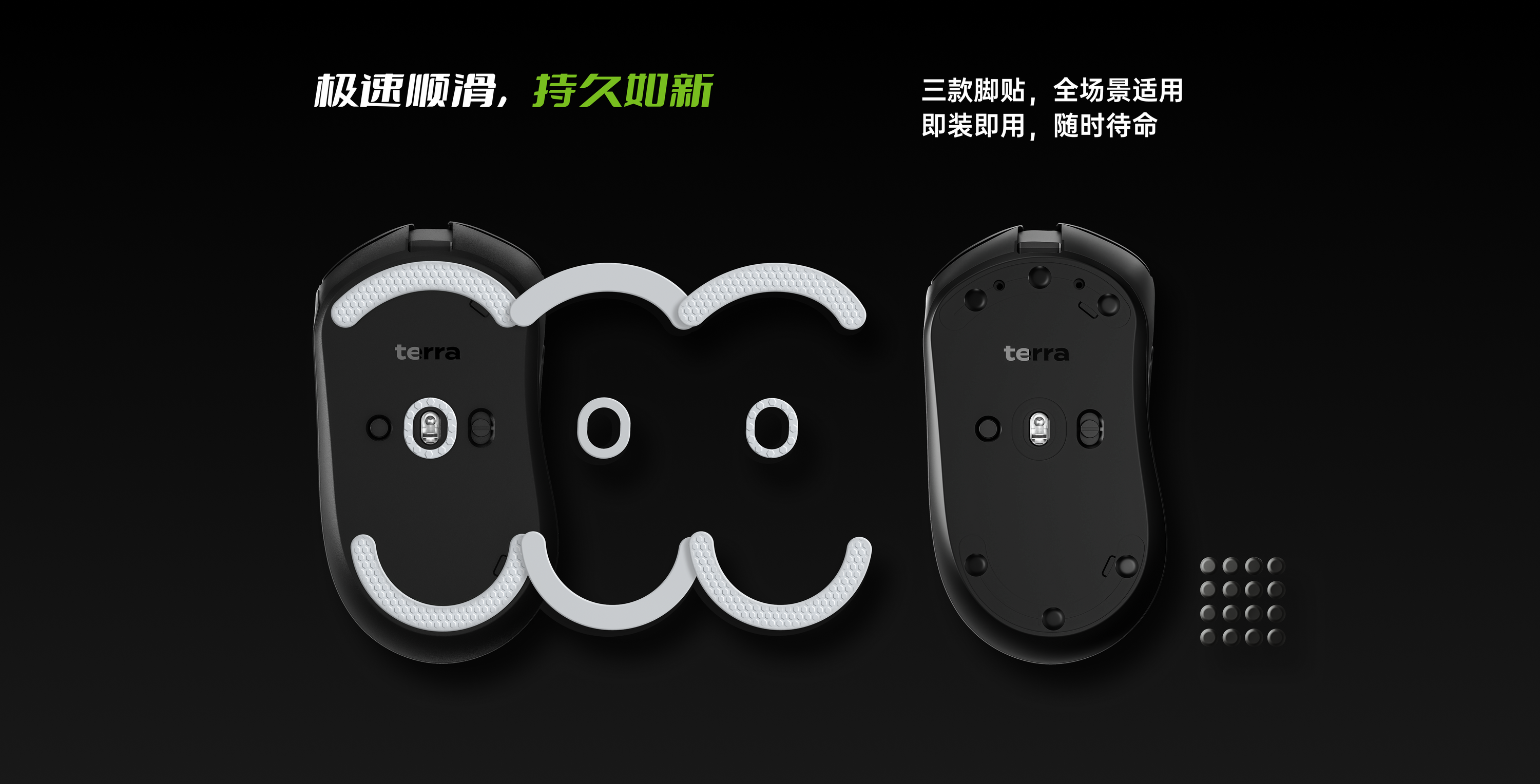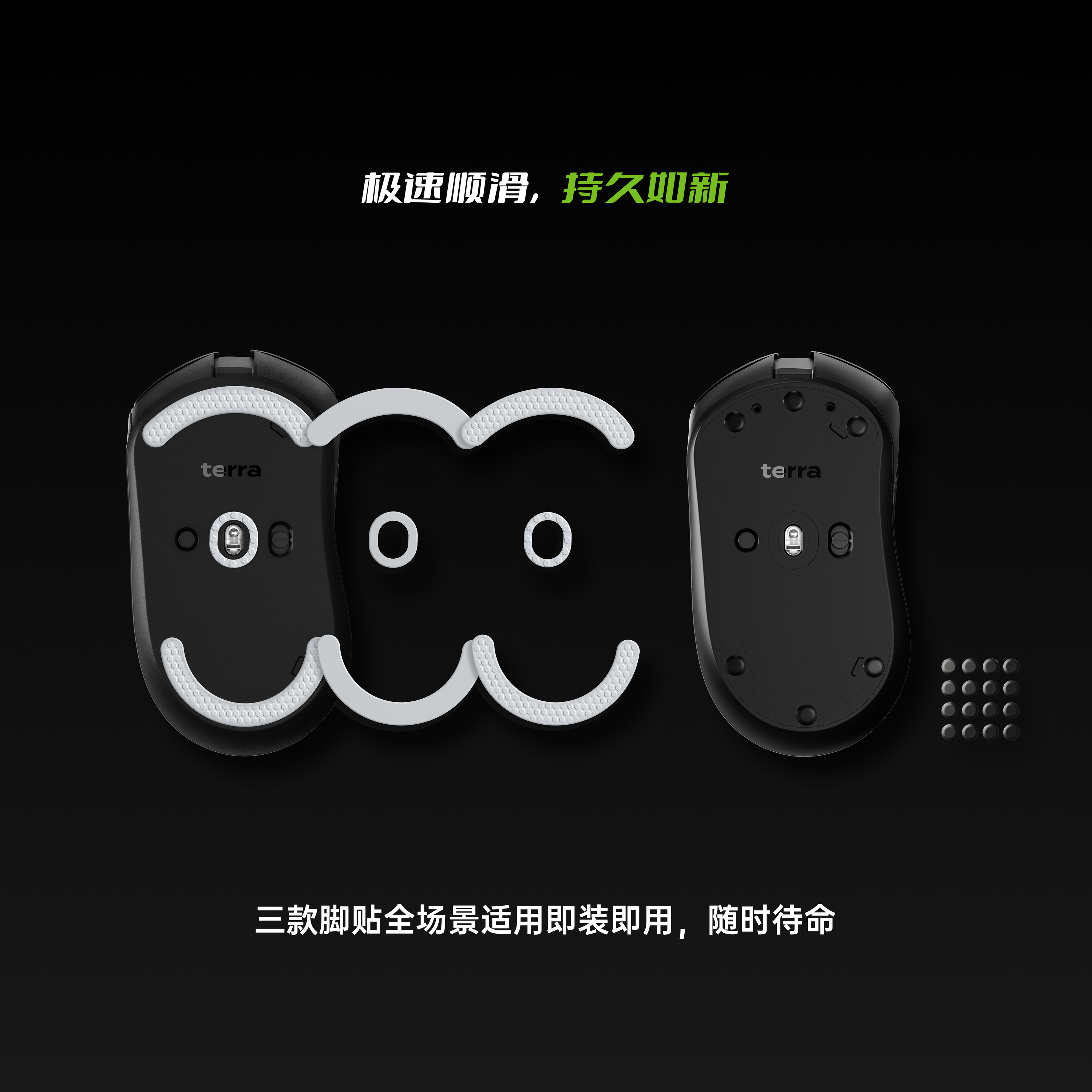 鼠标配件包将四款必备配件整合到一个功能齐全的一体化解决方案中,专为您的 Terra PRO 鼠标打造。它包含所有必需和备用配件,可提供稳定、可控的性能,让您畅享不间断的顶级游戏体验。